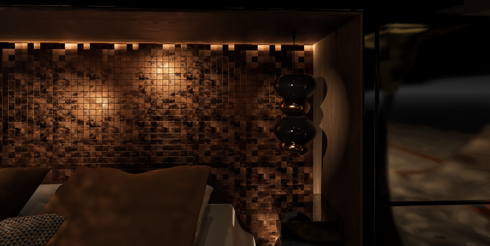 La chambre, initialement peu aménagée, a été transformée en un espace structuré et fonctionnel, pensé autour du lit comme élément central. Les rangements ont été intégrés en encadrement sur mesure, soulignant la zone nuit tout en libérant l’espace au sol. Réalisés en noir laqué brillant, ils font office de tête de lit architecturale et dialoguent avec un revêtement mural effet cuivre patiné, apportant profondeur et texture.