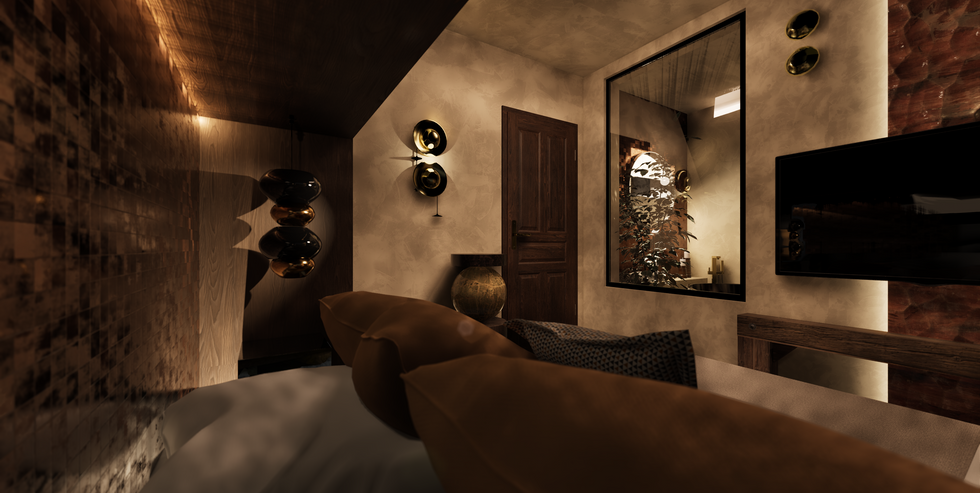 Face au lit, un meuble bas en bois massif rustique, associé à une télévision murale, apporte une touche authentique et contrastée. Les murs, traités dans des tonalités beige terre à l’aide d’un enduit minéral texturé, assurent une continuité visuelle avec la salle de bain. L’ensemble du sol, commun aux deux espaces, renforce la lecture fluide et cohérente de cette suite.