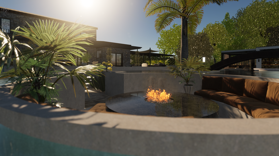 En contrebas, une passerelle en bois ancien traité mène à une plateforme circulaire entièrement dessinée sur mesure. Une banquette maçonnée épouse la forme ovale de l’espace et est habillée de coussins aux tonalités ocre, créant un contraste chaleureux avec le béton minéral. Au centre, une table basse circulaire intègre un foyer décoratif, pensé comme un élément d’ambiance pour les soirées, sans altérer la fonctionnalité de la surface périphérique en pierre naturelle.