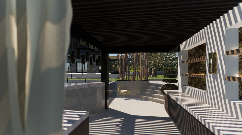 Au-dessus, une structure noire aux lames horizontales, dans la continuité de la pergola principale, unifie visuellement l’ensemble. Des suspensions aux fibres naturelles viennent adoucir la rigueur des lignes, tandis qu’un jeu d’ouvertures et de claustras métalliques filtre la lumière et préserve l’intimité sans rompre le lien avec le jardin.