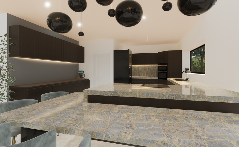 Cette base d’exception est sublimée par un spectaculaire plan de travail en Quartzite Blue Roma, bleu clair aux veinures dorées. Avec son épaisseur de 8 cm et sa continuité jusque dans la table attenante, ce matériau singulier confère à l’ensemble un caractère luxueux et unique, véritable pièce maîtresse du projet.
