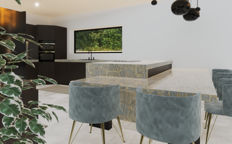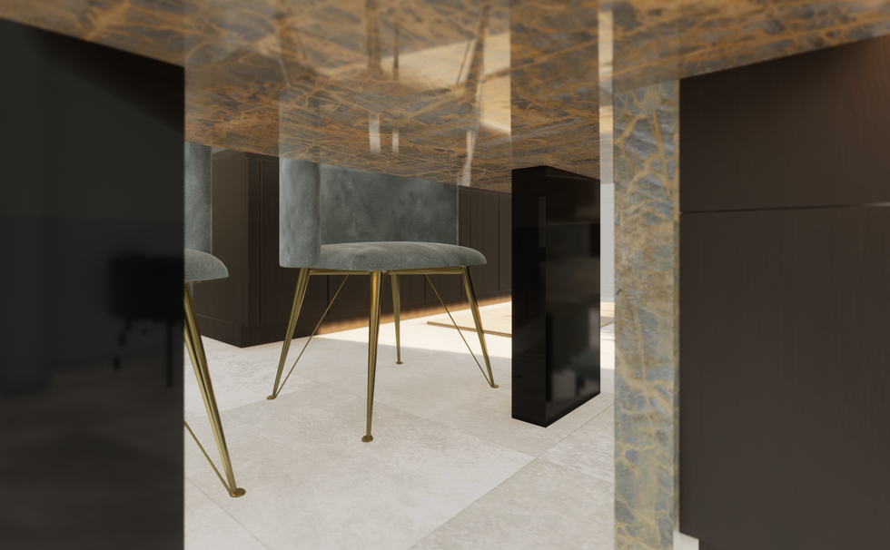 L’intégration d’une table à manger prolongée, directement issue du plan de travail, combine modernité et praticité. Conçue pour un couple n’ayant pas besoin d’un espace de réception imposant, elle permet un gain de place considérable tout en conservant un aspect esthétique fort et harmonieux.Pour souligner le raffinement de l’espace, nous avons sélectionné des chaises en velours bleu-gris, reposant sur des pieds en laiton doré. Leur éclat subtil fait écho aux veinures dorées du quartzite, créant une continuité visuelle élégante entre mobilier et matériaux.