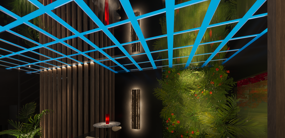 Le faux plafond, découpé en volumes asymétriques, intègre des lignes de LED colorées dont les variations lumineuses s’accordent au rythme de la musique diffusée par le DJ. Cet effet visuel rappelle la dynamique d’un éclair traversant le ciel et confère à l’espace une identité vibrante et immersive.