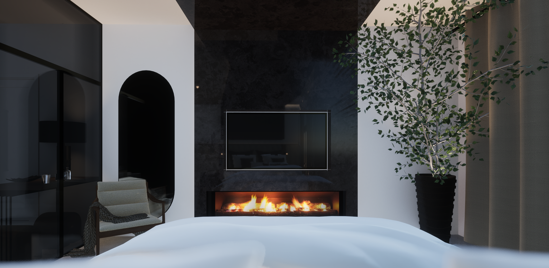La chambre a été conçue comme un véritable cocon, centré autour du lit. Nous avons créé une structure sur mesure, en placo, habillée de marbre noir et englobant la largeur du lit, les murs adjacents, et une partie du plafond. Cette réalisation sert de cadre intime, intégrant une cheminée élégante et un écran plat mural parfaitement encastré. Ce design confère à la chambre une atmosphère chaleureuse et sophistiquée, tout en évoquant le confort d’une suite haut de gamme d’hôtel.