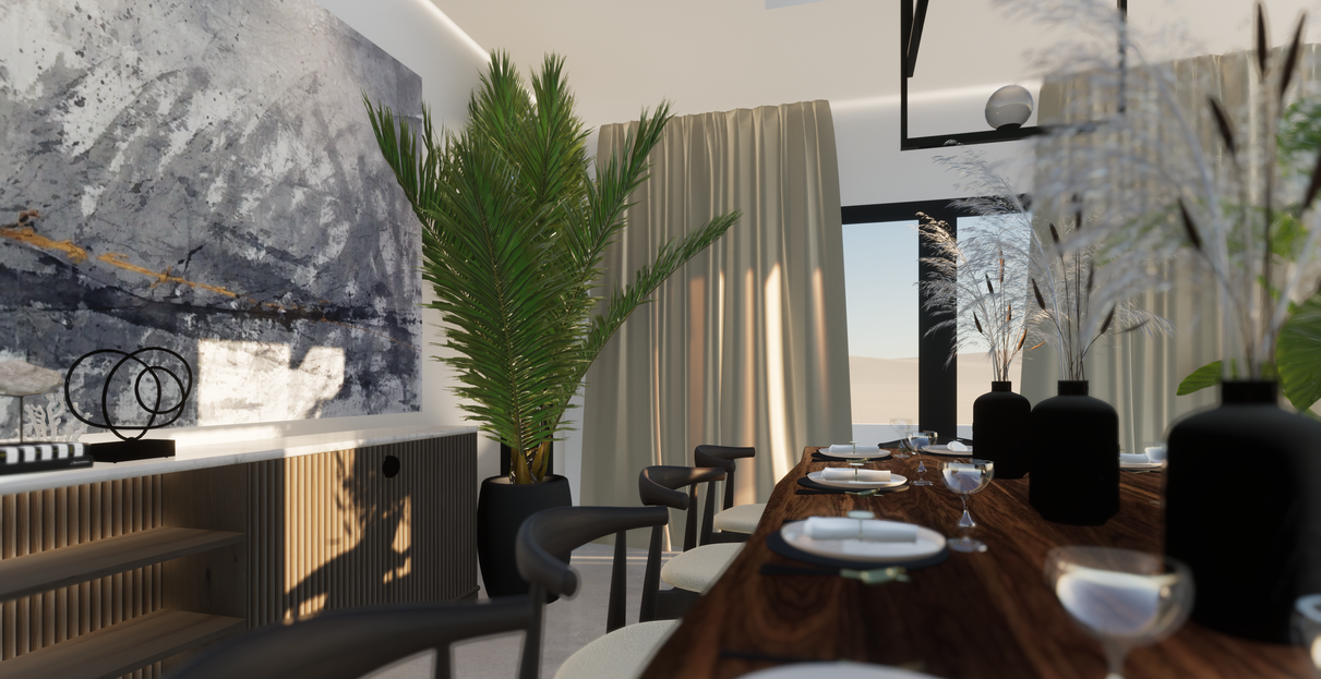 Nous avons métamorphosé un ancien garage, autrefois utilisé comme un mélange de bureaux, salle de sport et espaces de stockage, en une salle à manger contemporaine et design, pensée pour conjuguer esthétisme, fonctionnalité et convivialité. Au cœur de cet espace, une table unique réalisée sur mesure par un artisan capte immédiatement l’attention. Fabriquée en bois massif de forme naturelle, elle repose sur des pieds en métal entrecroisés, créant un jeu de lignes audacieux et un caractère fort. Autour de cette pièce maîtresse, nous avons disposé des chaises design en bois massif marron foncé, parfaitement assorties à une commode réalisée dans le même matériau. Cette dernière, surmontée d’un élégant plateau en marbre blanc, ajoute une touche de raffinement à l’ensemble.