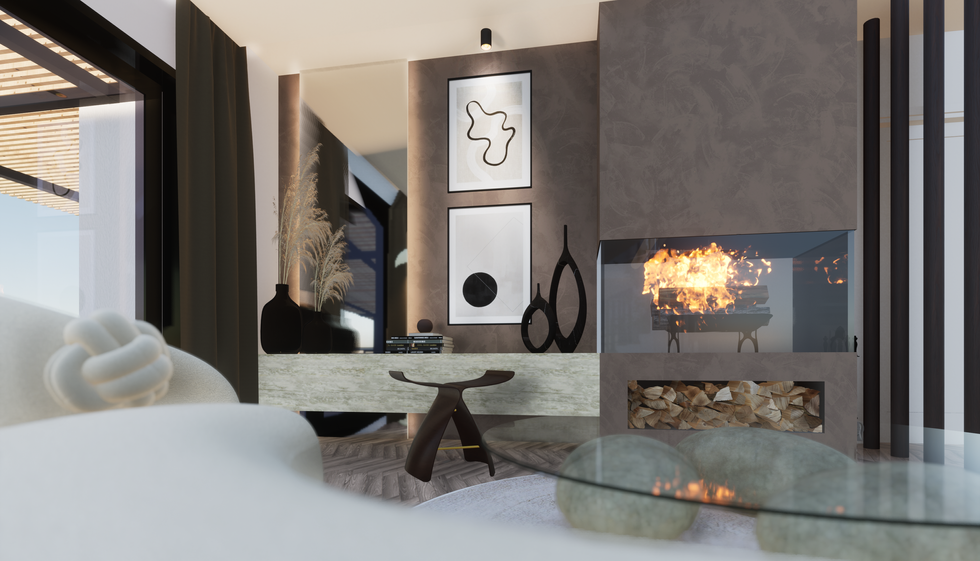Le mur de la cheminée a été redessiné dans un esprit épuré et contemporain, habillé d’une finition béton brossé à la chaux apportant texture et profondeur. Une commode murale sur mesure en marbre, alignée à la hauteur de la cheminée, complète cet ensemble avec sobriété et élégance.